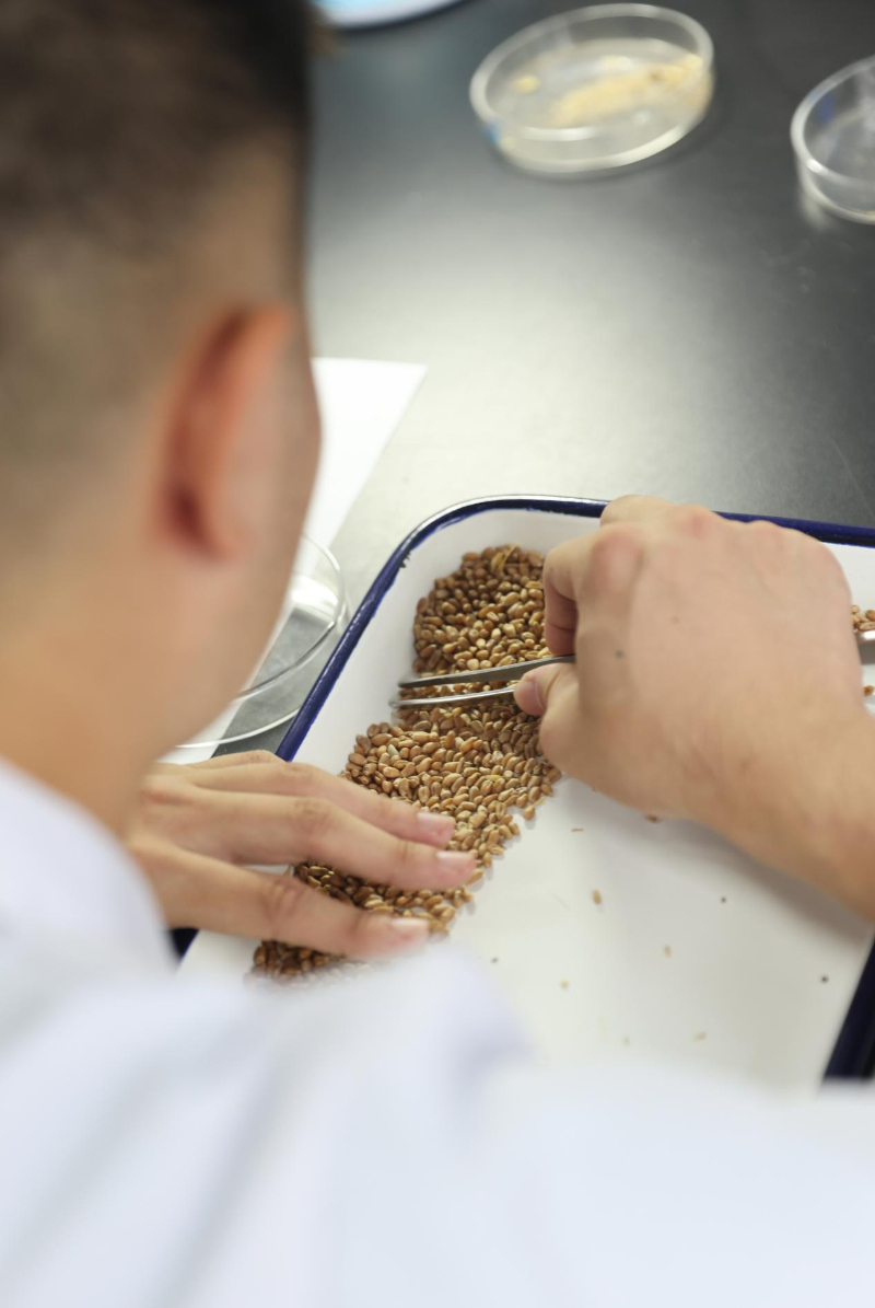 8月7日,中储粮滁州直属库高庙租仓点的工作人员正在检测小麦的不完善粒。新华网发